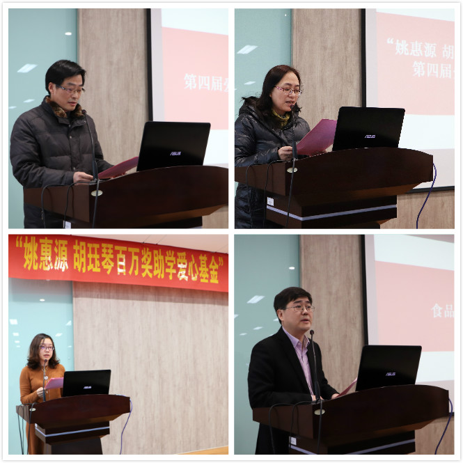 365英国上市官网在线党委副书记张文汇报了爱心奖助学金年度工作,分享了姚惠源教授夫妇设立“姚惠源 胡珏琴百万奖助学爱心基金”捐资助学、惠泽桑梓的善举,总结了四年的奖励资助情况。365英国上市官网在线副院长谢云飞宣读“姚惠源 胡珏琴百万奖助学爱心基金”第四届爱心奖助学金获奖名单并进行了颁奖仪式。周鸿媛等四十八名同学获得本年度奖学金、助学金和游学奖,邓博心等二十七位同学获得语言奖励,奖励资助总金额55.6万元。本届一等奖学金获得者2014级本科生于守娟同学代表获奖学生发言,她表达了强烈的感激之情和自勉之意。她表示,作为一个食品人,对责任的培养是每个食品人应有的担当;对科研的热忱是每个食品人心中的火苗;对食品的情怀是每个食品人心存的种子。。同时,历届奖助学金获得者也从全国各地的不同岗位上通过视频的形式向姚惠源教授传达了感激之情和问候祝福。