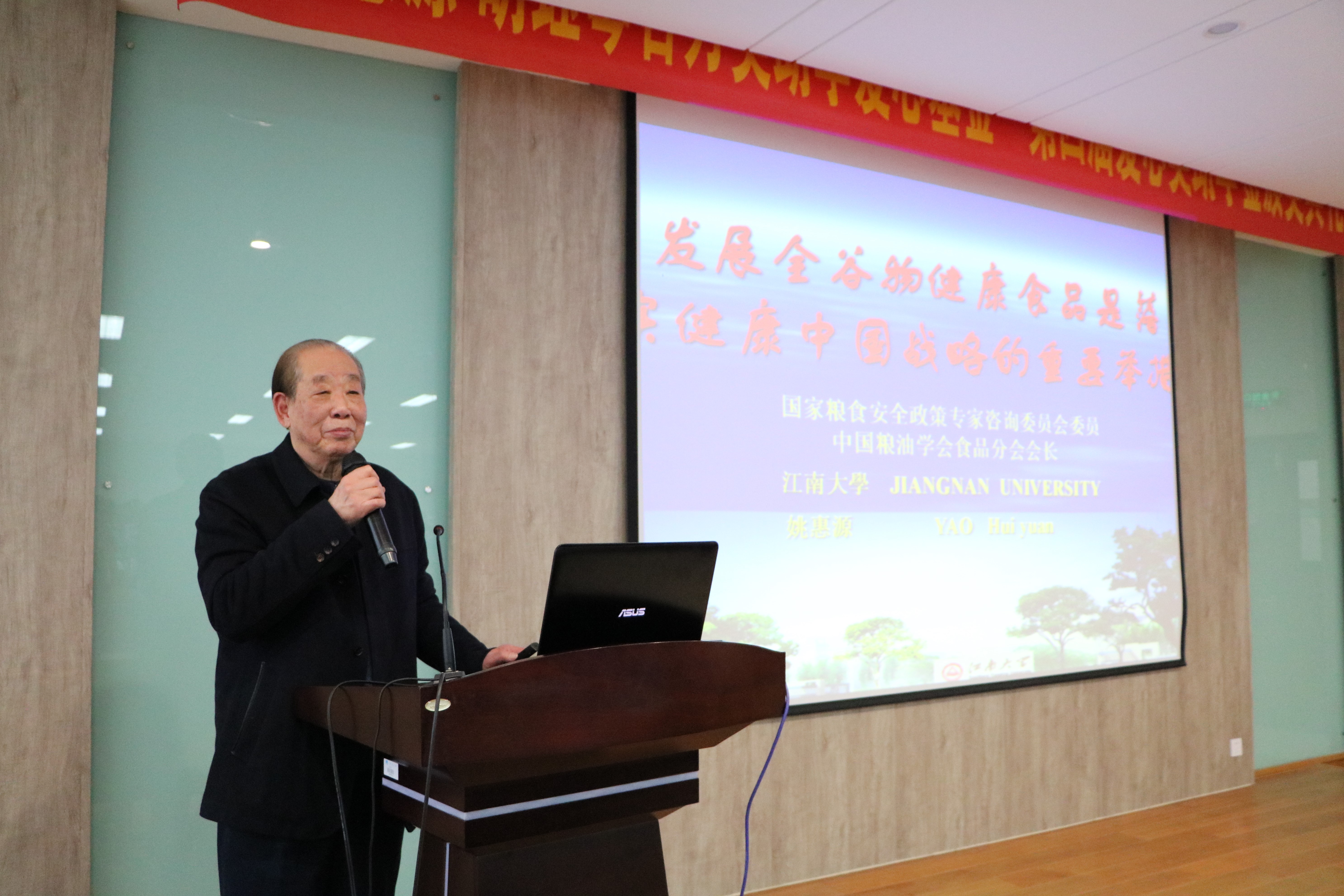 最后,年逾八十却依然活跃在食品科学领域一线的姚惠源教授做了“全谷物健康食品”主题报告,姚教授的报告不仅体现了一位资深食品人所拥有的长远的市场前瞻性,其丰厚、扎实的专业功底和激情澎湃的精彩的报告更是赢得在场师生阵阵掌声。