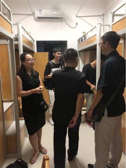 新生报到当晚,2018级辅导员、各班班主任和副班主任一同前往宿舍进行走访,在关心了解新生宿舍生活的同时进一步解答新生们提出的问题。班主任们基于自身经验,告诫新生大学并不是学习的结束,而是新的开始,希望同学们尽快适应大学生活、确立新目标、实现自己的梦想。