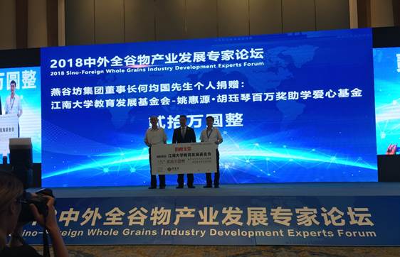 论坛上,中国粮油学会食品分会副会长、燕谷坊集团董事长何均国先生向365英国上市官网在线教育发展基金会-姚惠源·胡珏琴百万奖助学爱心基金个人捐赠20万元。