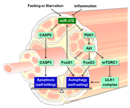 骨骼肌不仅可以维持体态与进行运动,同时在营养缺乏时还可以为机体提供能量,并有助于维持机体糖脂代谢稳态。但在生理与病理条件下(如饥饿),骨骼肌通常会发生萎缩,已有研究认为这可能和自噬凋亡水平的异常有关。小鼠骨骼肌中miR-378的缺失会导致骨骼肌重量下降、小鼠运动能力受损,同时受损细胞器出现异常积累与自噬小体缺失。本研究发现,在处于饥饿条件下,骨骼肌细胞中miR-378的表达呈现上升趋势。同时研究发现,当miR-378靶向胰岛素信号通路的关键蛋白PDK1时,会促进骨骼肌细胞进行自噬。进一步研究发现,miR-378可以通过靶向凋亡的起始蛋白CASP9,抑制骨骼肌细胞发生凋亡促进存活。在体内实验中,注射agomir-378过表达miR-378或敲除miR-378,均能证实miR-378在骨骼肌中增强自噬与抑制凋亡的作用。研究结果表明:在不同的营养状况下,机体可以通过调整骨骼肌miR-378的表达水平来适应代谢压力,通过增强自噬与和阻断凋亡起始来降低骨骼肌细胞凋亡的倾向。