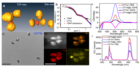 图1(a)上转换纳米粒子内嵌的手性纳米组装结构(UYTe);(b)手性纳米组装结构的SAXS表征;(c-d)UYTe结构的透射电镜图及元素分析表征;(e-f)L/D- UYTe的圆二色光谱响应和上转换发光图谱