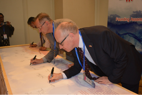 联盟秘书长刘元法宣读联盟《太湖宣言》后,联盟成员依次上台在卷轴上签署《太湖宣言》并合影记录这一宝贵的瞬间。本次“一带一路”高校食品科技联盟成立预备会议圆满结束。会后,成员代表纷纷合影留念,对联盟的未来表示充满信心。