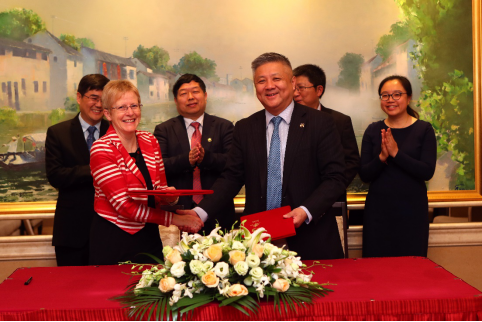 副校长徐岩与新西兰奥塔哥大学副校长Helen Nicholson签订联盟协议并握手合影