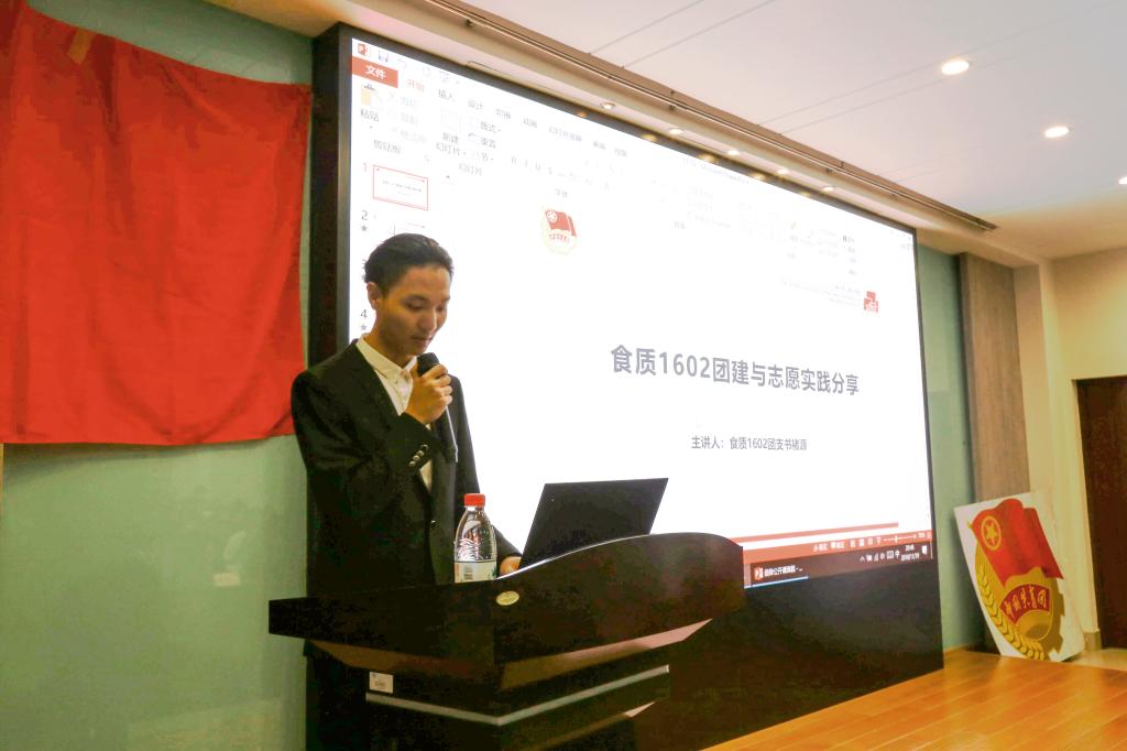 随后,食质1602“雷锋特称团支部”代表褚源上台向陶谦老师汇报了本支部三年的建设及志愿服务情况,并表示今后在学习和生活中不忘初心,争先创优,发挥模范带头作用。