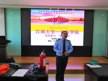 首先,朱教导员为大家作消防安全防火讲座,讲座从校园典型事故案例分析入手,讲了实验室防火安全注意事项;学校常见的火灾隐患及排查;办公区域用电用气安全注意事项;遇到突发性火灾如何带领学生疏散逃生和如何自防自救;如何对学生进行安全管理和教育;老师上下班车辆出行安全;常见消防器材的识别,使用及保养维护等方面问题。强调全体师生要强化消防意识,了解火灾起因,消灭潜在隐患。朱教官生动形象的讲解、风趣的授课方式让大家对此次讲座的记忆更加深刻。