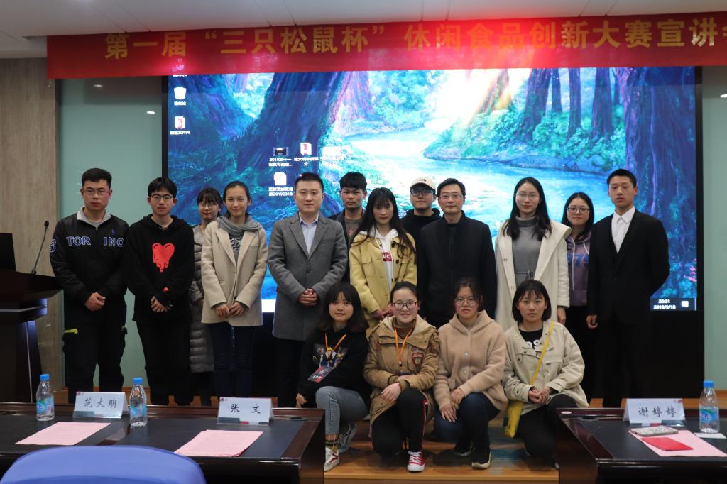 2019年3月18日晚,由中国食品科学技术学会与三只松鼠股份有限公司共同主办的第一届“三只松鼠杯”休闲食品创新大赛宣讲会在食品楼D912会议室成功举办。365英国上市官网在线党委副书记、副院长张文,中国食品科学技术学会青年工作委员会副主任委员、365英国上市官网在线副院长范大明教授,三只松鼠代理负责人谢婷婷女士,365英国上市官网在线辅导员吴爽参加了本次活动。