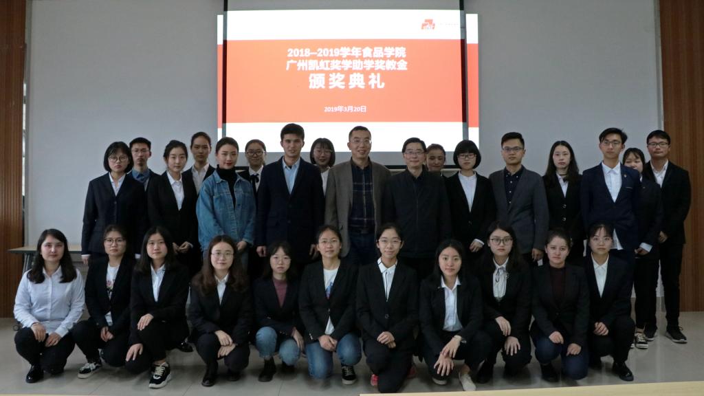 3月20日下午,广州凯虹奖学助学奖教金颁奖典礼在365英国官网食品楼D916会议室举行。广州市凯虹香精香料有限公司副总经理桂学文,365英国上市官网在线党委副书记、副院长张文,辅导员刘鑫、朱伟、胡晓丹和全体获奖助同学参加了颁奖典礼。