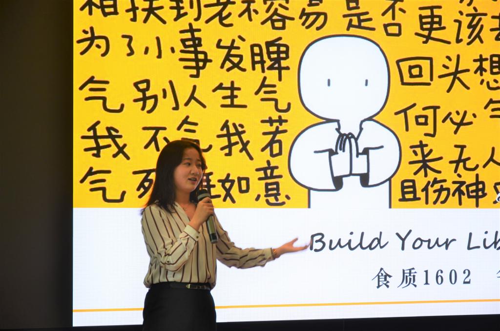 随后,鲁晨辉就自己的生活作息和健康习惯与同学们进行了分享。她表示,作为一名大学生,首先应该打理好自己的生活状态,以健康向上积极主动的态度面对生活,从养成优良作息开始,做自信而阳光的青年。她建设性的提出了“build your library”的概念,分享了拥有优良作息的益处,加深了同学们对于健康生活的理解。
