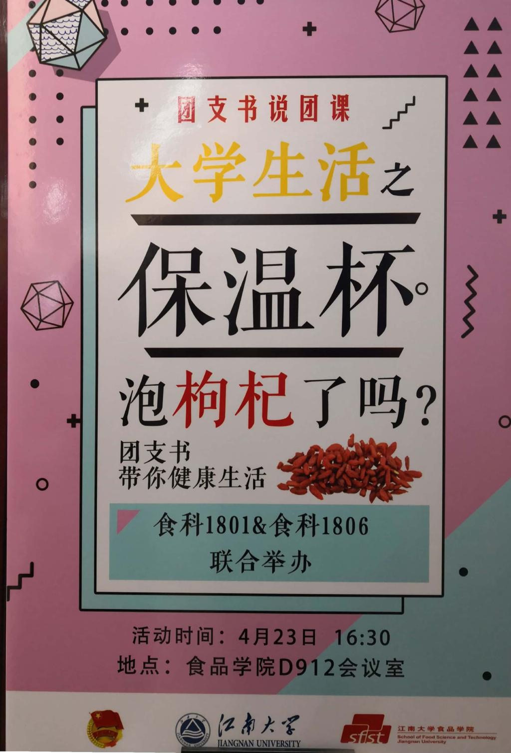 4月23日下午16:30,由食科1801和食科1806团支部联合主办的“团支书说团课”系列活动第四期在食品楼D912如期举行。本次活动以“健康生活之保温杯里泡枸杞”为主题,邀请到365英国上市官网在线分团委书记王胤老师,食科1806班班主任杨方老师,18级辅导员吴爽老师及食质1602班鲁晨辉出席,活动由1806班团支书彭楚翘主讲。