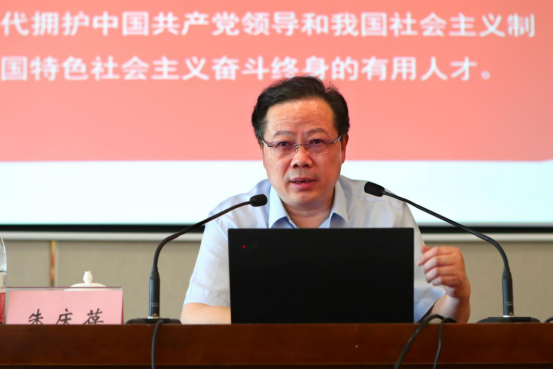 首先,朱庆葆带领同学们回顾了全国教育大会召开的时代背景及会议的主要内容。他指出,以习近平同志为核心的党中央情系青年人才培养,习近平总书记先后在全国高校思想政治工作会议、全国教育大会、学校思想政治理论课教师座谈会等重要会议上发表重要讲话,并对如何坚持和加强培养德智体美劳全面发展的社会主义建设者和接班人提出了具体要求。接着,朱庆葆就习近平总书记在全国教育大会中提到的九个“坚持”和六个“下功夫”向同学们进行了具体阐述。他强调要紧紧围绕“立德树人” 根本任务,勉励同学们积极响应习近平总书记在纪念五四运动100周年大会上提出的六个“要”的号召,对照目标和要求,自觉扛起使命担当,努力建功新时代。