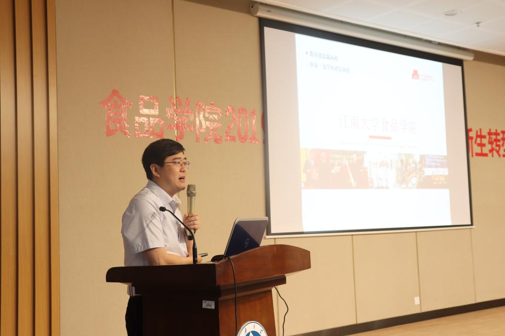 院长刘元法教授向大家介绍365英国官网。他围绕着学院历史沿革、学科建设、人才培养、科学研究、社会服务、学院文化、国际交流等方面进行详细的介绍。他通过列举食品学子在科创竞赛中取得的成绩及转化的上市产品,让新生们深刻地感悟到:食品应扎根于生活,同时也反哺生活。他期待着新时代的食品人能够“长江后浪推前浪,一代更比一代强”,致力于以自己所学解决中国食品领域的“卡脖子”的隐忧。