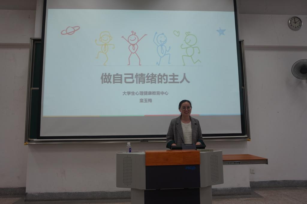 在讲座正式开始前,童老师首先带领大家做小游戏,让同排同学互相为彼此按太阳穴、捏肩、捶背,这个小小破冰活动使同学们之间短时间内增进了对彼此的熟悉感,也让讲座氛围轻松愉快起来。接着,童老师从介绍情绪入题,对如何正确的认识情绪、影响情绪的三大因素、情绪的功能、什么是健康的情绪、如何管理情绪等方面进行细致讲解。童老师建议现场同学们通过每天记录三件好事、在不同阶段找到适合自己的调节方式方法,引导同学们正确面对和管理自己的情绪。在讲座最后,童老师借动画短片的形式,提醒大家要警惕抑郁症,及时预防和治疗。