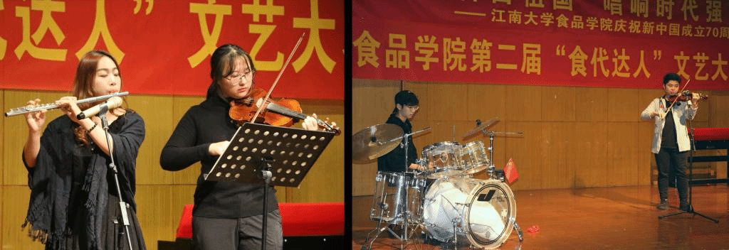 决赛伊始,主持人首先向大家介绍了到场嘉宾以及评比规则。随后,进入决赛的12组同学逐一登台献艺。他们褪去初赛时的紧张状态,以精心准备的表演为在座观众呈现了一场视听盛宴,赢得掌声阵阵。王胤老师和童红燕也对选手们的表演给予精彩点评,鼓励更多的食品学子参与到文体活动中,秀出别样的食代风采。