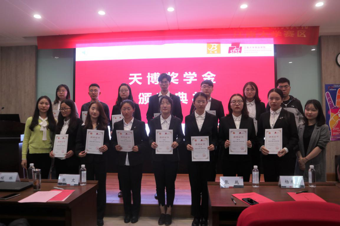 随后在天博奖学金的颁奖典礼上,嘉宾们为获得天博奖学金的19名同学颁发了证书并合影留念。天博奖学金获得者郭柏汝代表获奖学生发言,她对天博公司提供的平台和资助表达了诚挚的感谢,也鼓励同学们能够努力学习、积极参赛。