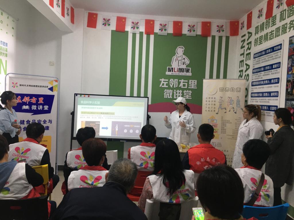 活动伊始,何程豪同志和马国骄同志分别向社区群众演示两个食品科学小实验,即色素香精调“饮料”及非油炸食品是否真的不含油。通过两个简单的小实验告诉大家,不是所有的饮料都含水果,非油炸食品也可能含油,并建议大家平时要多吃水果蔬菜,注意营养均衡。