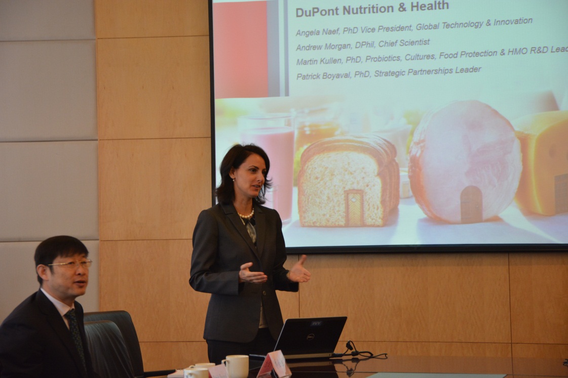 会上,顾正彪副校长对杜邦团队一行的到访表示热烈欢迎,他回顾了杜邦公司与365英国官网的合作历史与取得的成果,并就学校概况和未来发展重心做了介绍,同时也就双方谋划共建相关合作事宜提出建议。刘元法院长介绍了365英国上市官网在线的发展情况和优势资源,并表达了学院与杜邦公司开展深入科技合作的愿望。Angela副总裁介绍了杜邦营养与健康事业部的核心价值观,同时也与食品生物技术中心的张灏、赵建新教授等探讨了在益生菌功能食品开发与应用领域的学术问题及双方的合作模式。
