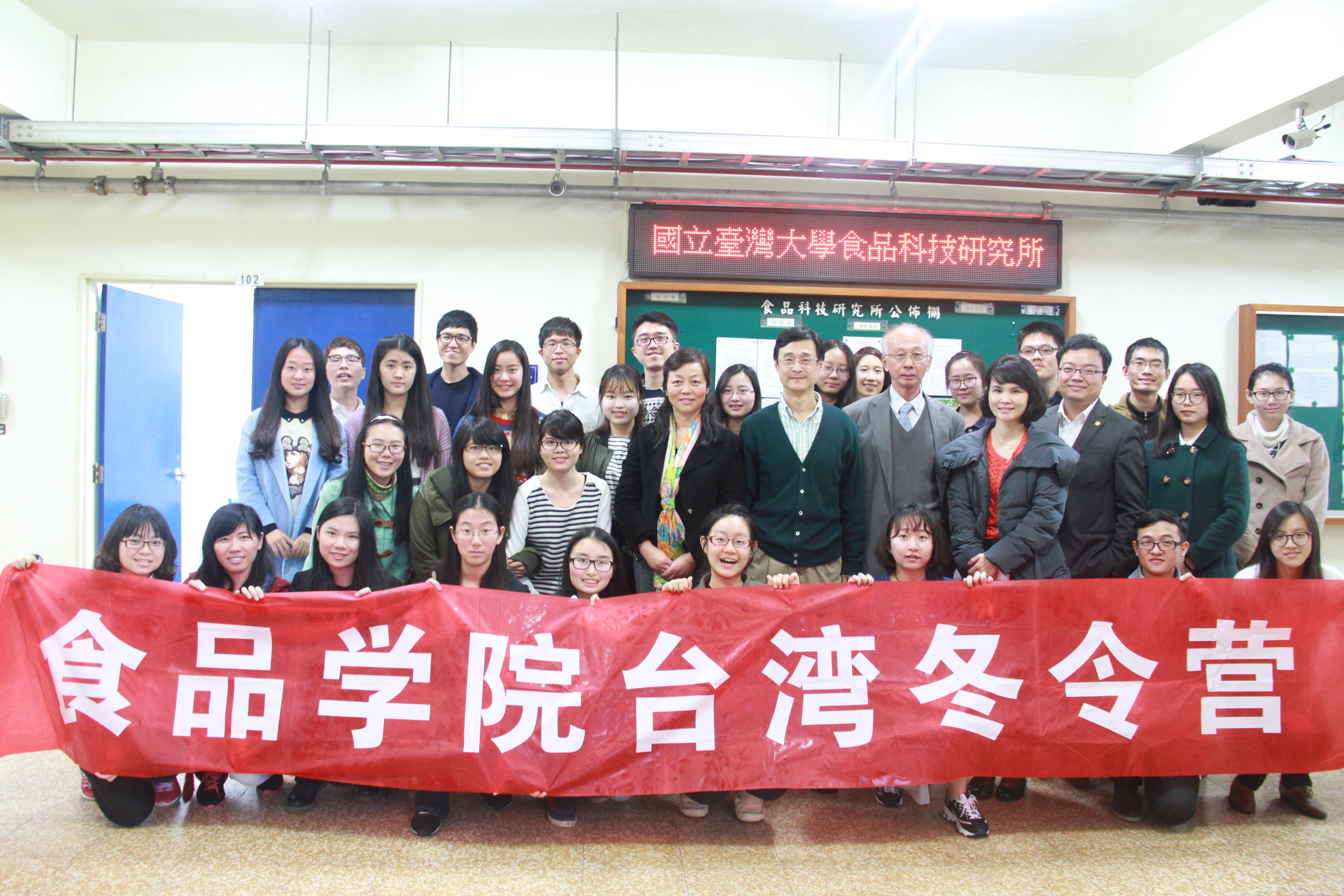 在台湾大学,食品科技研究所郑光成教授等一行师生热情接待了游学团,在台大研究所师生的带领下参观了占地辽阔、生态优美的台大校园。在参观校园后,台湾大学食品科技研究所所长接待并安排了一场两岸师生的交流,双方在实验室安全、本科生教育以及高级人才培养等方面进行讨论,交换了彼此的看法和建议,会议厅内气氛活泼而热烈。临别前,研究所学生们送上了精致的礼物,以表情谊。
