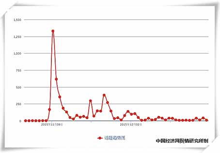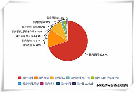 中国经济网舆情研究所监测数据显示,2015年11月1日至2015年12月25日共监测到相关新闻报道3865条,博客80篇,论坛565条,微博5774条,微信2002条。从该事件的网络舆情占比图可以看出,新闻和微博、微信对其讨论较多,博客和论坛的相关内容较少 。