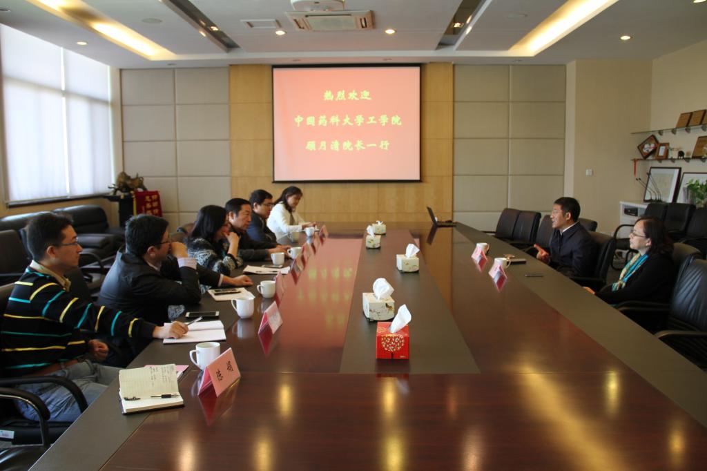 10月12日上午,中国药科大学工学院院长顾月清、党委书记郝运学一行8人来我院交流。我院院长陈卫、党委书记向琪接待了来宾并参加交流。