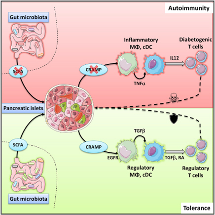 图注:肠道菌群产生短链脂肪酸促进胰腺α-和β-细胞表达CRAMP,发挥免疫调节作用从而预防自身免疫糖尿病的发病。