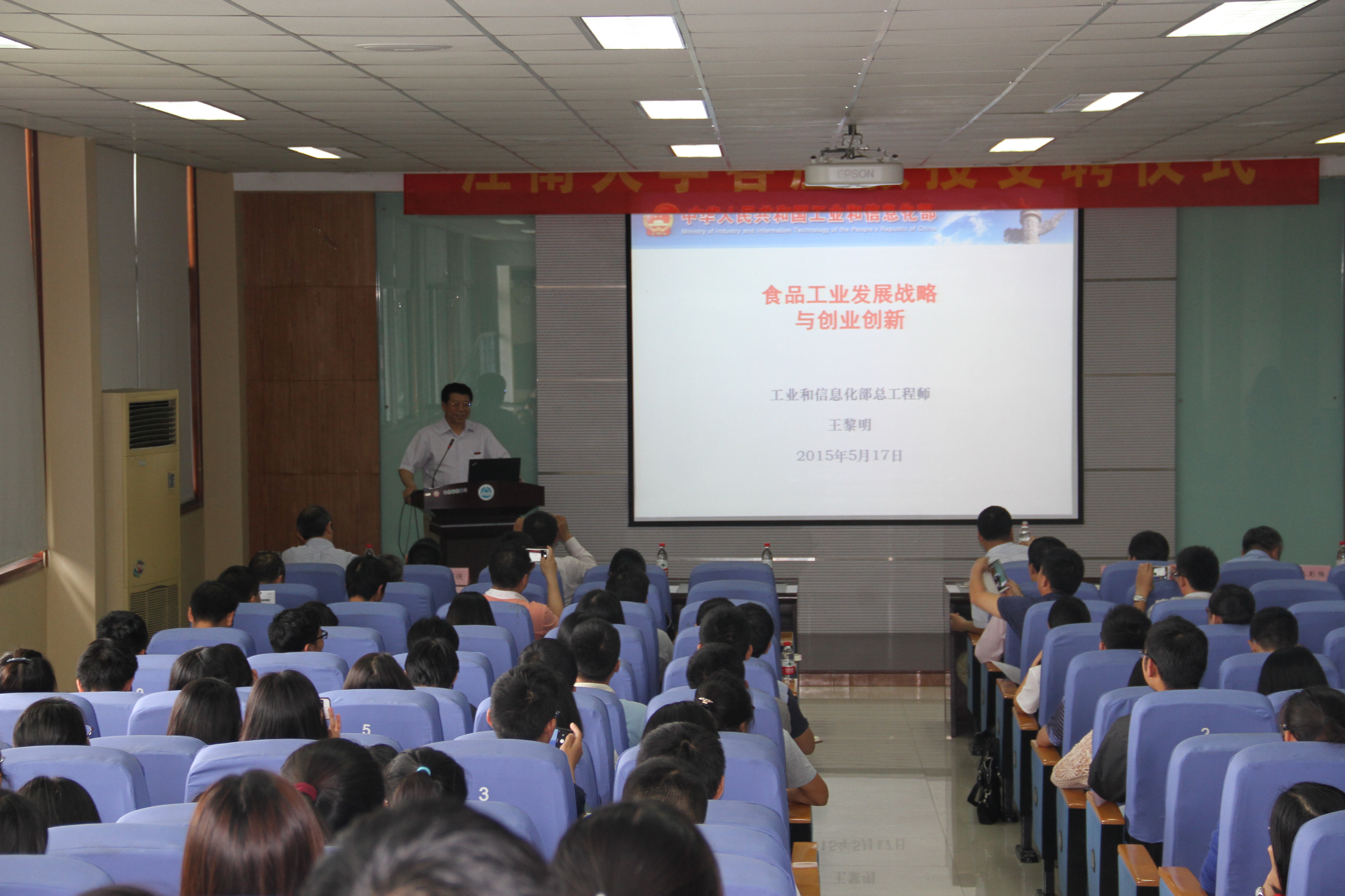 王黎明总工程师为365英国上市官网在线师生作题为“食品工业发展战略和创业创新”专题学术报告,报告会由副校长纪志成主持。将近两个小时的报告中,王总工程师理论联系实际,用精炼生动的语言和大量翔实数据案例高屋建瓴地分析了我国食品工业发展现状以及未来发展趋势,并对如何推动创业创新以及高校大学生如何开展创业创新提出深刻独到见解。他指出高校要把创业教育纳入到人才培养目标中。大学生就业创业首要前提是拥有良好素质,一是正直、正派,二是有思想,三是敬业态度,三者具备才能实现自我价值,才能成就事业。报告结束后,他还与在场师生进行交流互动,讲座在热烈掌声中圆满结束。此次高水平的学术报告会开阔了师生学术视野,取得良好效果。(365英国上市官网在线 文/图:李萍;审核:向琪)