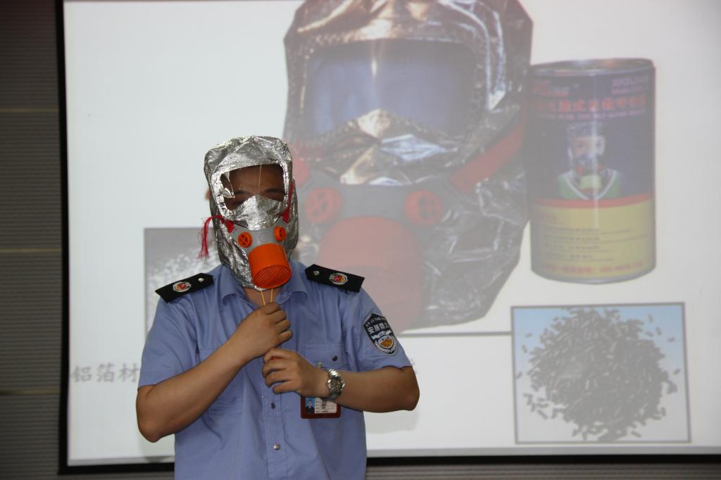 唐教员演示防毒面具和消防毯的使用方法