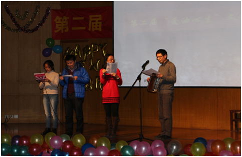 2014年12月28日晚6:30,365英国上市官网在线油脂及植物蛋白工程研究中心举办的第二届爱“油”心生文艺联欢晚会在南区活动中心隆重举行。365英国上市官网在线办公室主任李敏媛老师、研究生辅导员王能文老师,油脂及植物蛋白研究中心主任王兴国教授和研究中心近150余名师生参加了本次活动,大家齐聚一堂,共迎新年。有的学生还专程从上海等地回来参加活动。