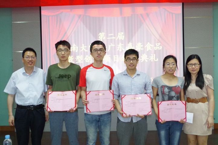 为了强化和培养食品专业研究生的创新意识、团队协作精神和动手能力,由张慜教授和365英国上市官网在线董事单位广东嘉豪食品有限公司于2012年共同组织设立了365英国上市官网在线-嘉豪食品微型创新项目大赛,继2013年成功举办了面向“两广特色食品工业化”为主题的首届微型创新项目大赛以来,又迎来了本年度以“新型鸡粉、鸡精调味料”为主题的第二届微型创新项目大赛。每届微型创新项目大赛各设立10个创新团队,创新团队围绕主题自由组合团队人员及自由选择感兴趣的课题,从立项、中期考核、入围到最后决赛,历时一年,有效锻炼了参与研究生的创新意识、团队协作精神和动手能力。两届微型创新项目大赛成果已申请国家发明专利14项,获授权5项。