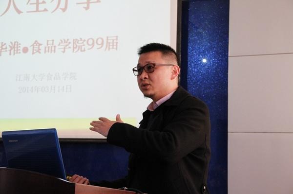 讲座中,校友方华淮总经理结合食品行业15年销售一线的经验以及创业理念,介绍了毕业之后的成长与收获。他将自己的经验总结浓缩为五部分——人生三部曲,人生信条,择业三原则,面试三问,职场四句话。校友平原总经理以“如何开展人生的第一份工作”为主题,以新龟兔赛跑,蘑菇理论,端茶倒水等生动的小故事,深入浅出地传授了职场法则。两位主讲人还就“如何成为领导的左右手”这一话题分享了他们的大学生活以及职场、创业心得,并和同学们进行了积极互动。