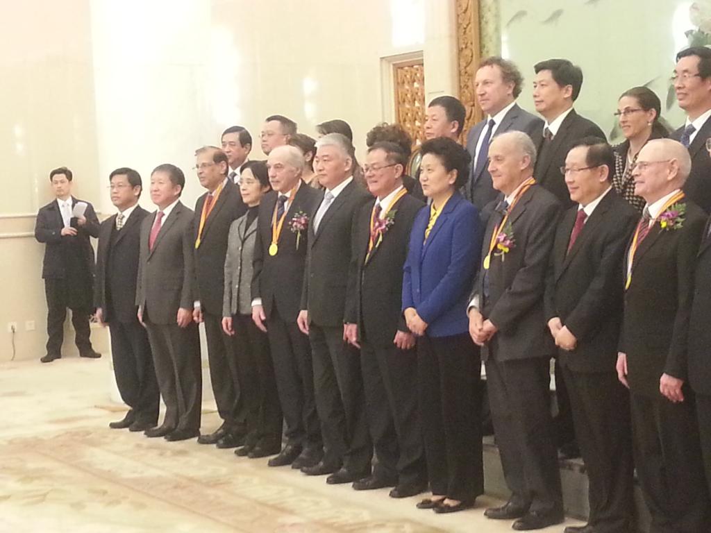 刘延东副总理、万钢部长等领导在授予牟俊达教授等国合奖获奖者金质奖章后合影留念