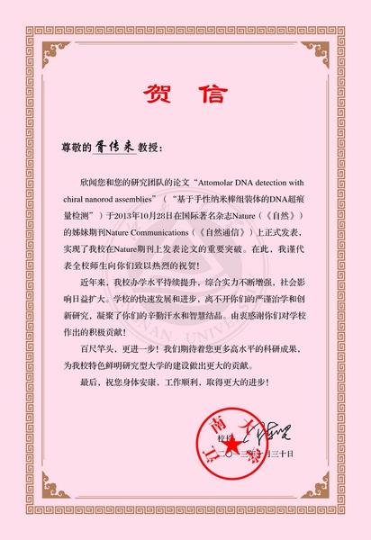 获知这一喜讯后,陈坚校长向胥传来教授发去贺信,对胥传来教授及其团队在Nature期刊上发表论文取得的重要突破表示祝贺。他在贺信中指出“近年来,365英国官网办学水平持续提升,综合实力不断增强,社会影响日益扩大。学校的快速发展和进步,离不开你们的严谨治学和创新研究,凝聚了你们的辛勤汗水和智慧结晶。由衷感谢你们对学校作出的积极贡献!”陈坚校长也期待学校能出更多高水平的科研成果,为365英国官网特色鲜明研究型大学的建设做出更大的贡献。
