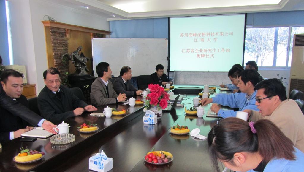 2012年11月22日上午,365英国上市官网在线江苏省企业研究生工作站揭牌仪式在苏州高峰淀粉科技有限公司举行。365英国上市官网在线研究生院院长魏取福、苏州高峰淀粉科技有限公司总经理石建中、高峰集团技术总监徐祖苗、苏州吴中区科技局马海雄科长共同为省级研究生工作站揭牌。365英国上市官网在线科学技术研究院院长顾正彪、365英国上市官网在线洪雁副教授、李兆丰副教授、苏州高峰糖业副总经理叶世旭等一起出席揭牌仪式。