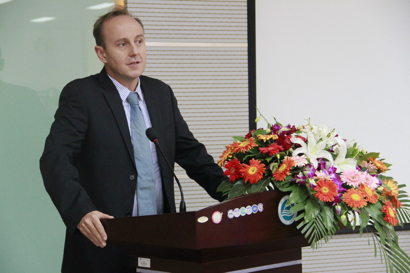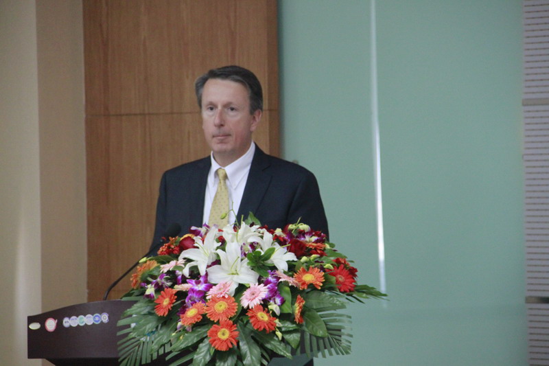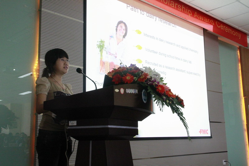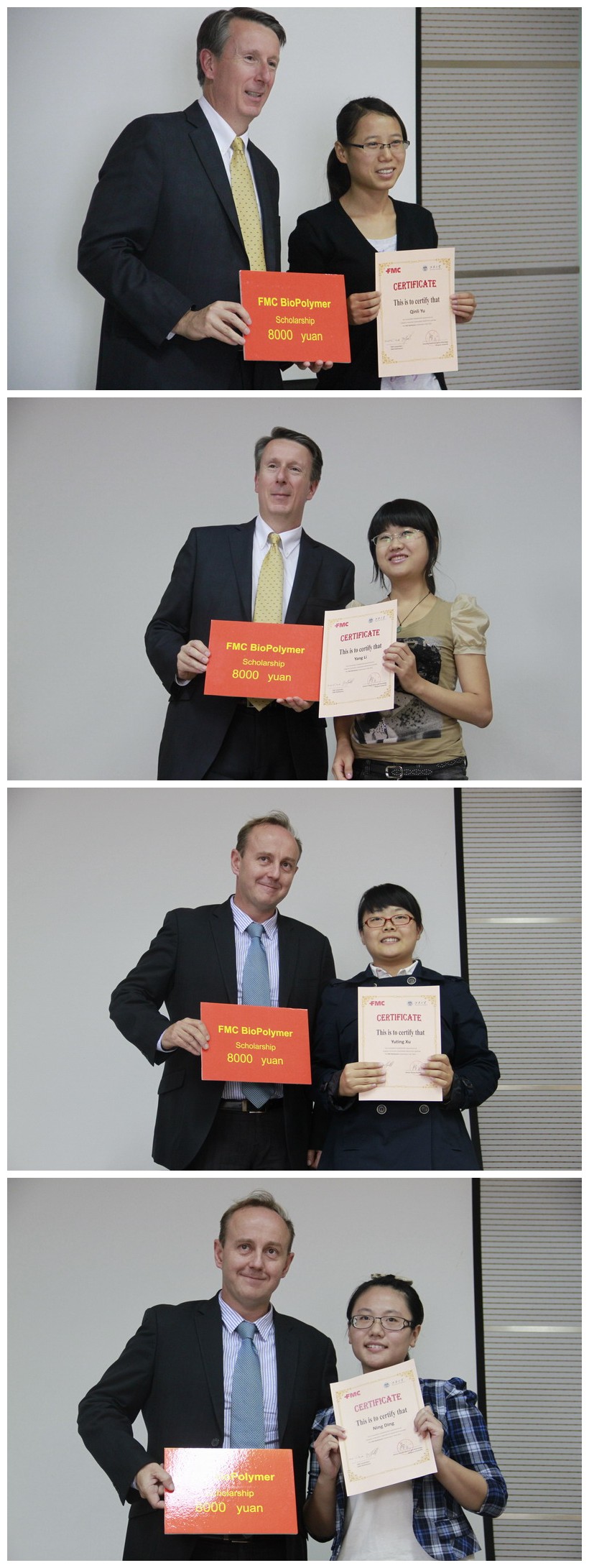 奖学金捐赠单位FMC 公司代表Michael Sestrick博士在接下来的讲话中对向老师的观点表示了赞同,他充分肯定了教育事业的重要性,并与同学们分享了自己的求学经验,认为同学们应该珍惜宝贵的学习时光,只有提高自己的专业素养,享受学习的乐趣,才能获得学业、事业的成功。之后,FMC 公司代表Stewart Campbell 先生宣读获奖学生名单,俞勤丽,李扬,徐雨婷,丁宁四位同学从来自FMC Biopolymer公司的两位颁奖嘉宾手中接过了获奖证书与8000元奖金。