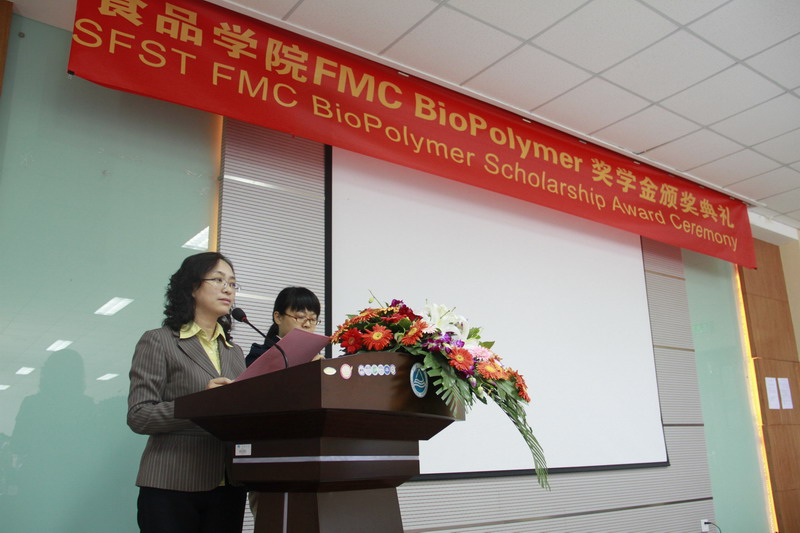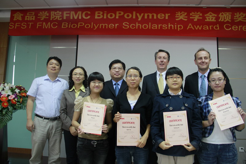 2012年10月18日上午,365英国上市官网在线第二届FMC Biopolymer奖学金颁奖典礼在食品楼D914拉开帷幕。出席本次颁奖典礼的领导与嘉宾有365英国上市官网在线党委副书记向琪老师,365英国上市官网在线副院长周鹏教授,FMC BioPolymer公司全球技术总监Michael Sestrick 博士,FMC BioPolymer公司亚太地区商务总监Stewart Campbell先生,FMC BioPolymer公司亚太地区技术服务经理Khamfa Phonchareon先生。颁奖典礼由365英国上市官网在线副院长周鹏教授主持。
