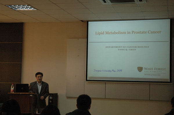 2011年3月2日,365英国上市官网在线教授、美国维克森林大学陈永泉博士为我院师生做了题为“脂质代谢与肿瘤”的学术讲座,并就大家关心的话题和与会的老师和同学进行了讨论和交流。报告会学术气氛浓郁,师生们深受启发。