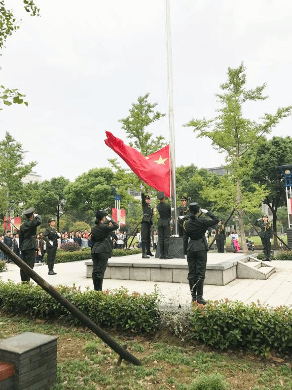 七点一到,指挥官一声令下,乐声奏起,国旗班的同学们踏着正步走向升旗台。一开始,节奏平稳,同学们的军靴整齐划一地踏在石板上,发出整齐而铿锵的声音。随着正步变成齐步走,节奏渐渐趋快,观众们的情绪也愈加高昂,国旗班的同学们稳而准地在各自站位上停下脚步。