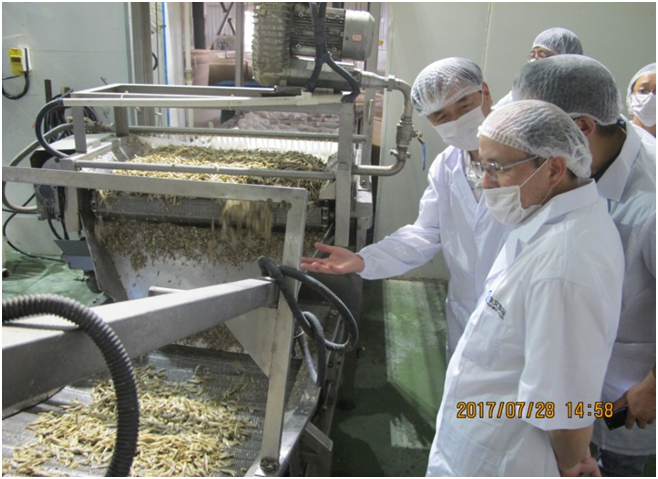 博士团一行首先到访了位于岳阳市平江县的华文食品的休闲食品生产车间,据刘特元副总经理介绍,华文食品有限公司现有生产基地占地200余亩、员工2000余人,公司在平江县投入巨资建设高自动化水平的现代化生产基地。主要产品是休闲鱼制品和休闲豆制品,其中休闲鱼制品稳据行业前列,豆制品排名进入行业前列,旗下“劲仔”、“博味园”品牌已成为行业知名品牌,营销网络覆盖全国,并远销美国、加拿大等海外市场。公司与国内知名设备生产商合作研发升级改造全自动化鱼制品生产线,不断加强研发创新,拥有重金属脱除剂及利用其脱除鱼类产品中重金属的方法、提高豆干质构的方法等多项发明专利。