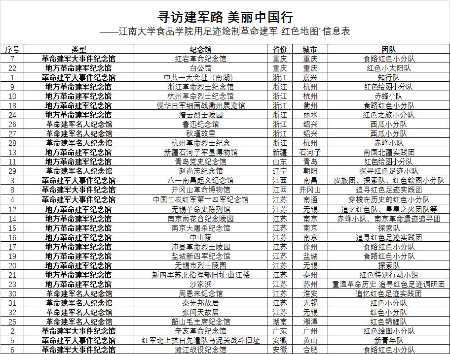 此次实践地点包括“革命建军大事件纪念馆”、“地方革命建军纪念馆”、“革命建军名人纪念馆”三类。
