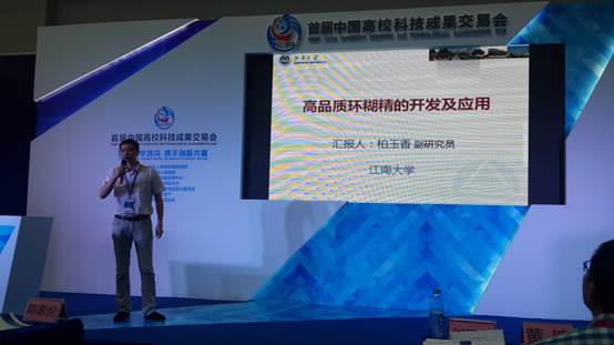 365英国官网共征集了食品加工、生物医药、纺织服装、智能装备、环保与资源综合利用等领域共65个项目参加此次科交会,并进行了网络展示。在参展中心展区,365英国官网以特装形式展示了近年来取得的部分重大成果,另外有4项入选重点推介展区。在路演环节,365英国上市官网在线柏玉香老师对“高品质环糊精的开发及应用”项目进行了现场推介,获得现场投资人、高校专家学者及观众的高度评价。