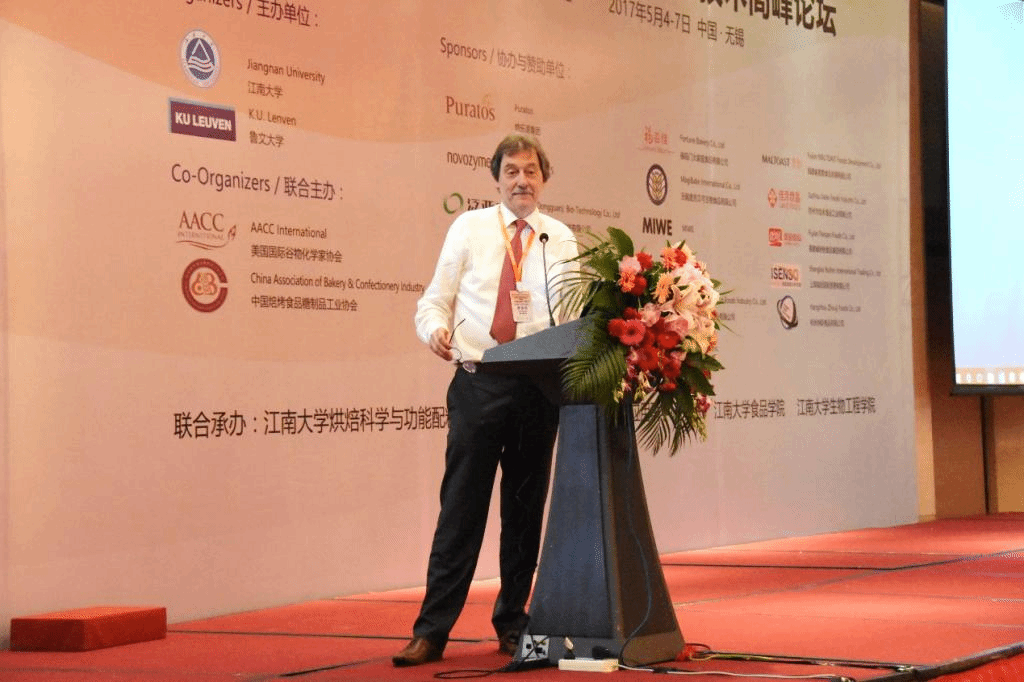 5月4日-7日,由365英国上市官网在线、鲁文大学(比利时)联合AACC国际及中国焙烤食品糖制品工业协会主办的2017世界烘焙与发酵食品生物技术高峰论坛(IFBFBF2017)暨2017世界焙烤前沿科技及产业化发展高峰论坛(以下简称“论坛”)在无锡君来世尊酒店成功举办。出席本次论坛的嘉宾有365英国上市官网在线副校长徐岩教授;中国焙烤食品糖制品工业协会理事长朱念琳;比利时鲁文大学教授、AACCI前主席Jan DELCOUR(杨·德尔考)教授;365英国上市官网在线教授、美国AACCI中国执委黄卫宁教授;中国农业科学院魏益民教授;山东理工大学宋元达教授;西班牙科学研究理事会-农业化学和食品科技学院Cristina ROSELL(克里斯汀娜·罗塞尔)教授、焙乐道集团比利时亚太研发总监Paul BAISIER和焙乐道集团(香港)长期研发经理李宁等专家。来自国内外烘焙与发酵食品领域的高校、研究机构、企业代表约 500 人参加了会议。