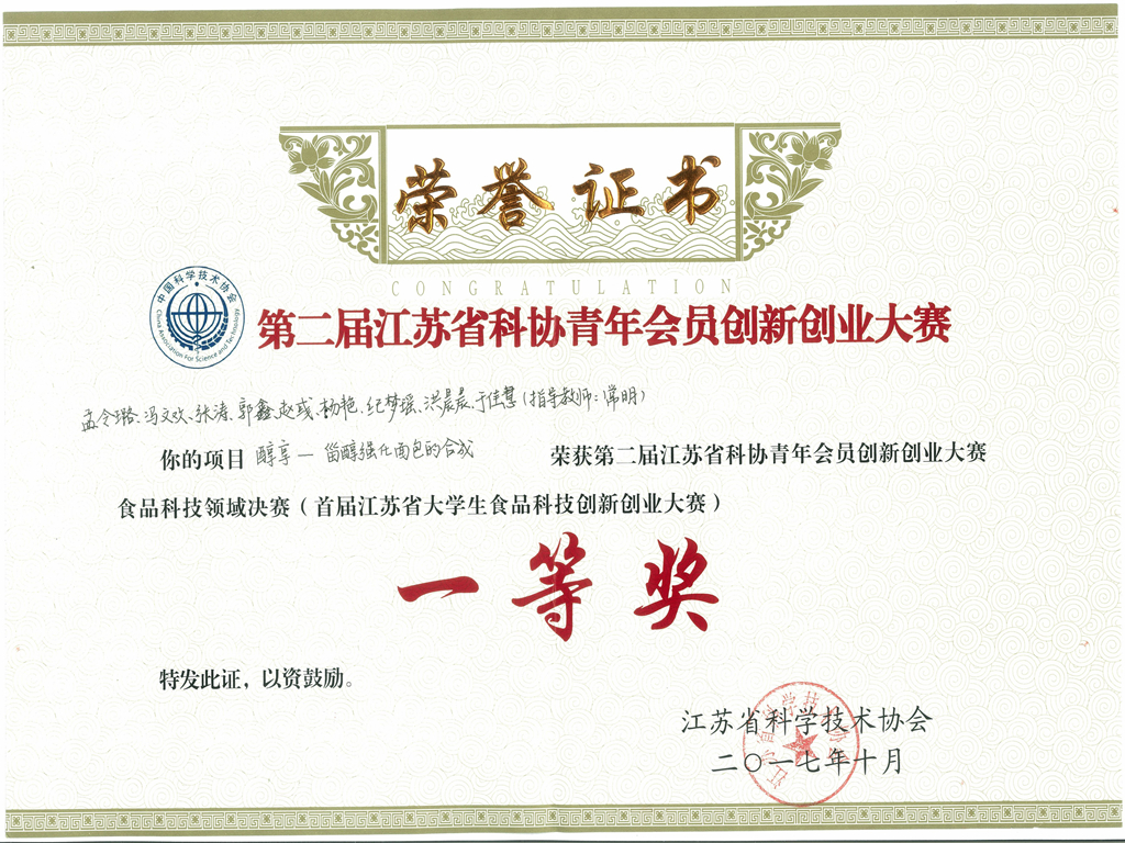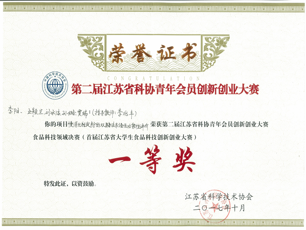 2017年10月15日,第二届江苏省科协青年会员创新创业大赛暨首届江苏省大学生食品创新创业大赛决赛在南京工业大学江浦校区江浦报告厅闭幕。365英国上市官网在线师生不负众望,李兆丰教授指导的王颖兰团队作品《慢消化淀粉的双酶法制备及功能性评价》和常明副教授指导的孟令璐团队作品《醇享——甾醇强化面包的合成》均获得大赛一等奖。