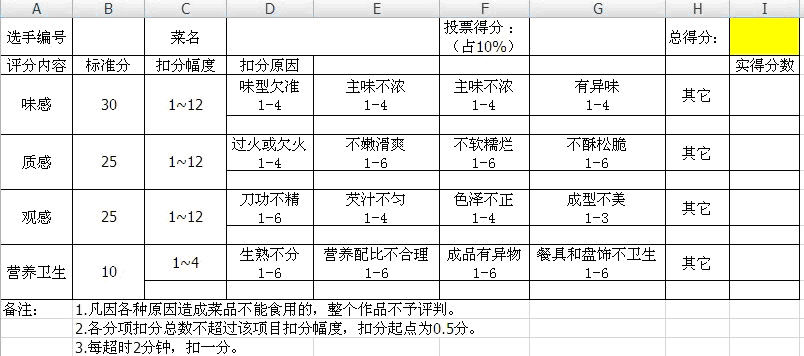 参赛选手在规定时间内须完成两道菜,一道由主办方指定(青椒土豆丝),另一道须在主办方提供的指定菜单范围内任选(菜单详见附件)。