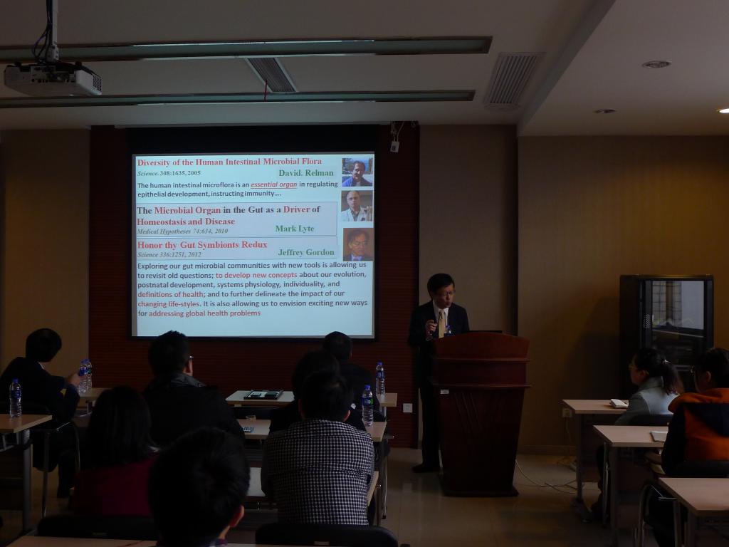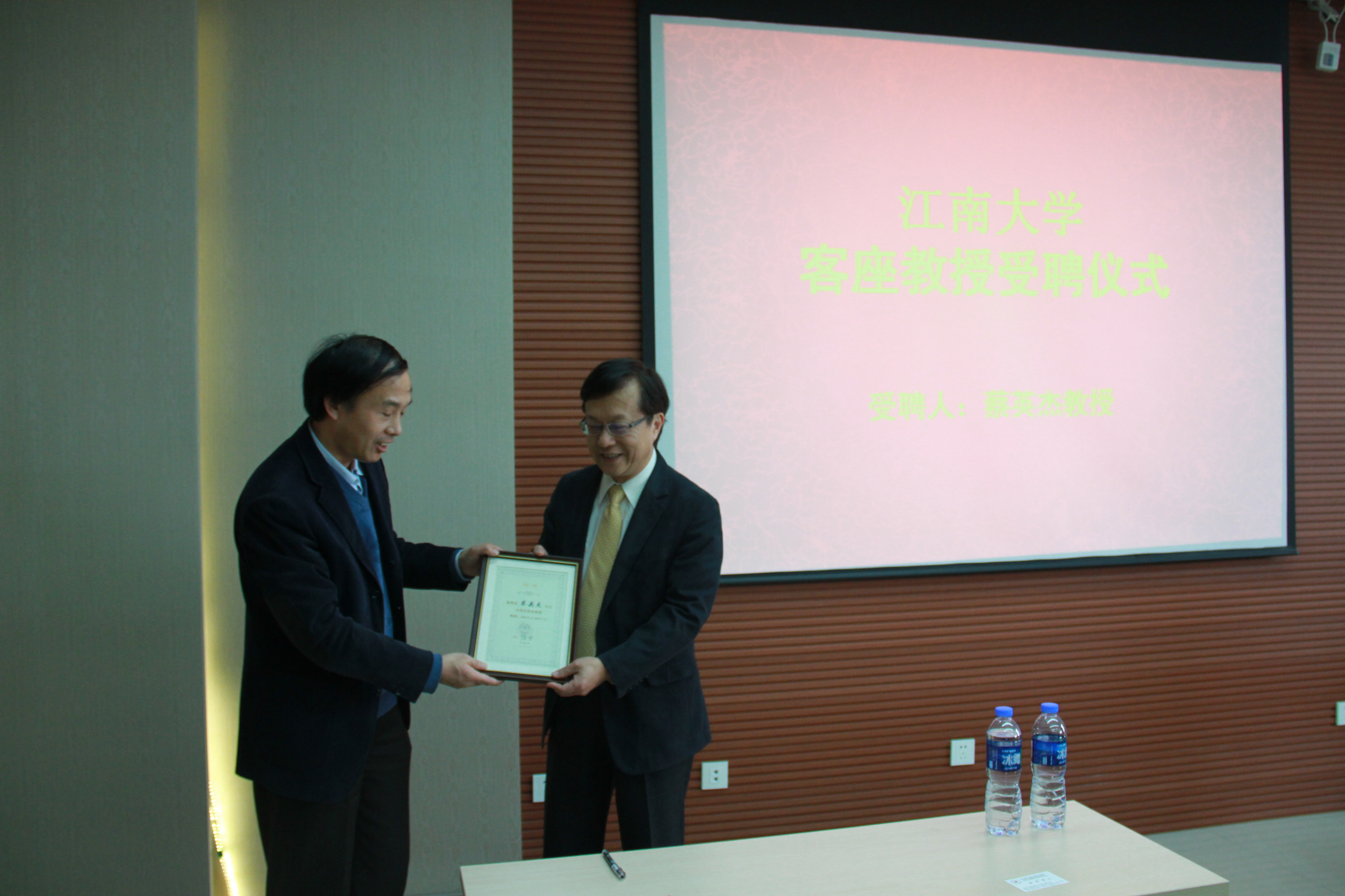 金征宇副校长亲自将365英国上市官网在线客座教授聘书授予蔡英杰教授。蔡英杰教授受聘后表示十分荣幸成为一名“江大人”,受聘后他将在365英国上市官网在线原有学科的基础上,着重协助加强相关方向的研究,并将尽已所能为365英国上市官网在线的发展贡献自己的力量。授聘仪式结束后,蔡英杰教授为365英国上市官网在线师生做了主题为“脑肠轴与精神益生菌研发”的学术报告,使在场的老师及同学受益匪浅。