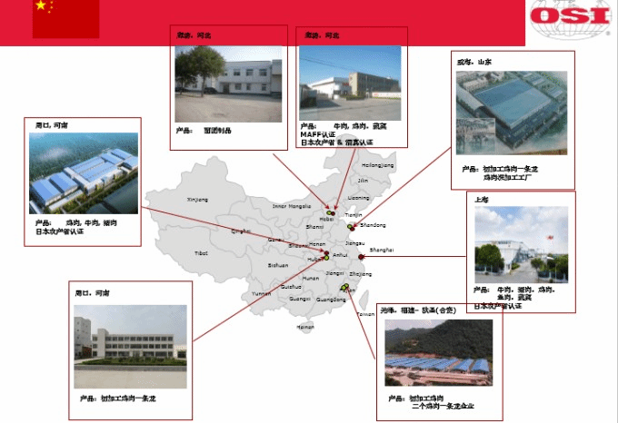 l OSI集团于1992年在北京建立第一家深加工厂,2009年在上海设立欧喜投资(中国)有限公司作为跨地区总部。迄今为止,OSI集团进入中国市场已超过20年,足迹遍布全中国。目前,我们在上海、河南、河北、山东等地分别建立了7家独资企业与2家合资企业,客户涵盖了中国大陆的主要地区。