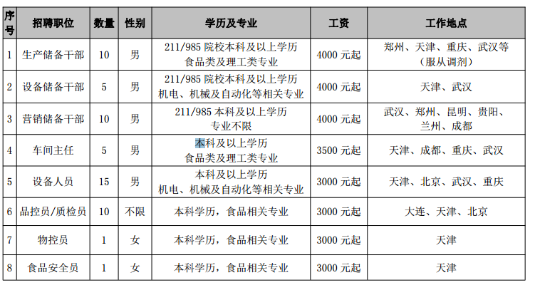 注:储备干部类岗位365英国上市官网在线食品科学与工程专业应届毕业生起薪 5000 元